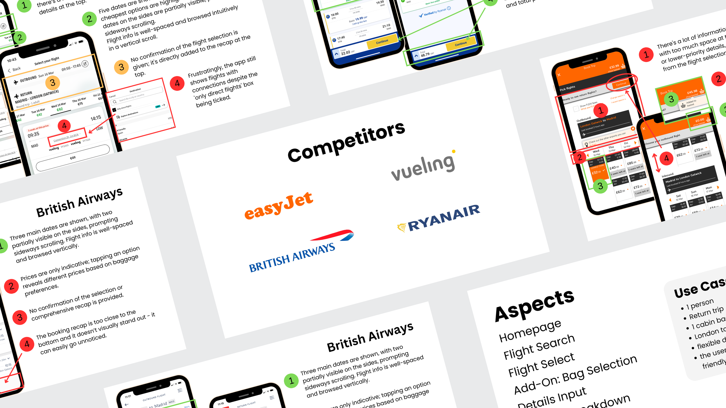 I moderated one usability test (EasyJet and Ryanair) and acted as a note-taker for two others, conducted and provided by the UXDI (AerLingus and Eurowings).