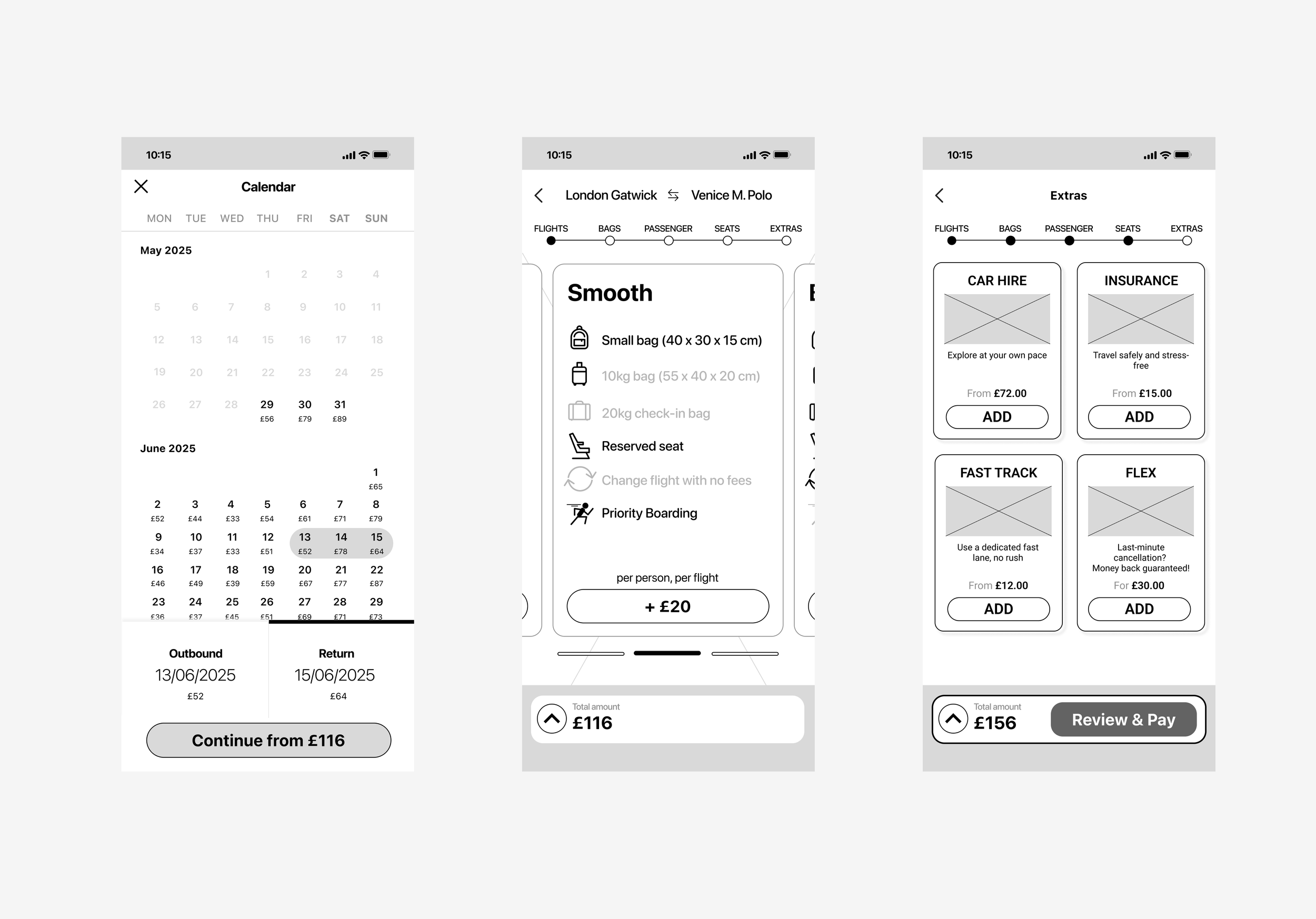 Next-step wording: The button shows “Continue from £xxx” after date selection, gently hinting that the displayed amount is not final.